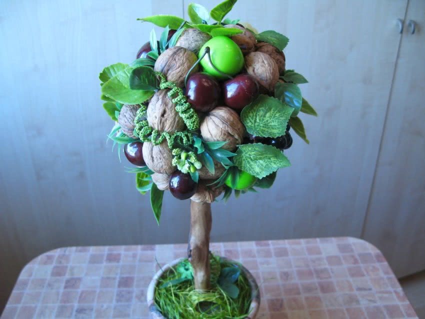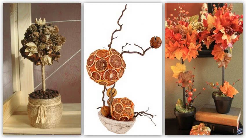В качестве осенней поделки такой топиарий включает еще каштаны, желуди, орехи и листья.