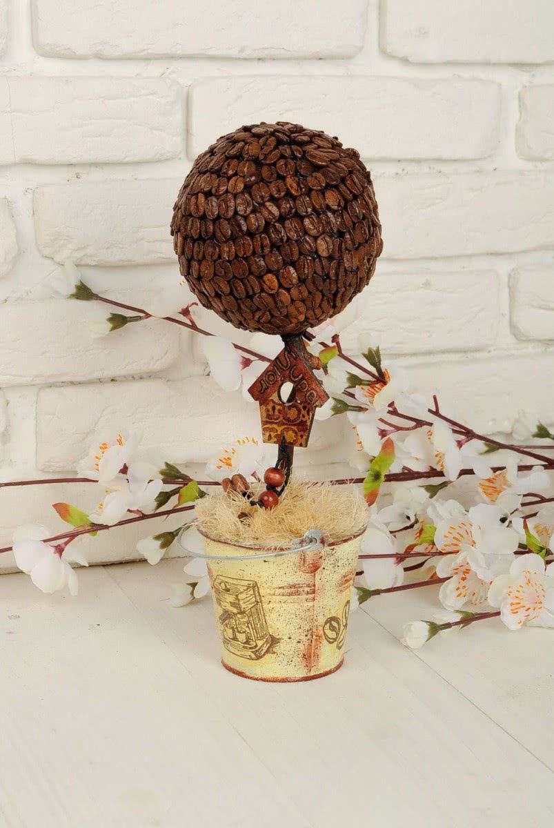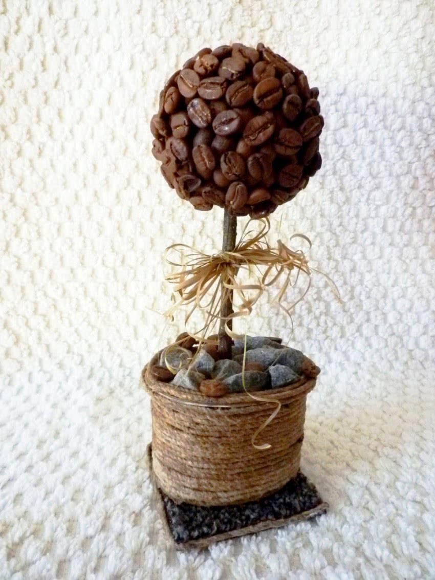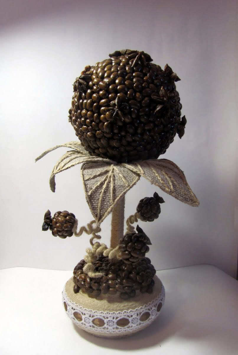 3. Клеим первый слой кофейных зерен. Лучше всего это сделать клеем ПВА (суперклей начнет разъедать пенопласт). Желательно наносить клей на небольшой участок и потом приклеить зерна и так пока вся поверхность шарика (не считая место, оставленное для ствола) не будет заполнена. При прикладывании зерен к клею, прижимайте их немного.