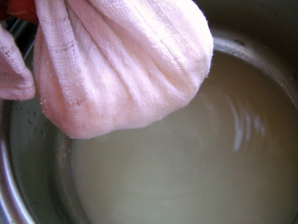 - На заранее приготовленную марлю (либо отрез синтетического мелкоячеистого сетчатого материала) откидываем образовавшуюся массу.