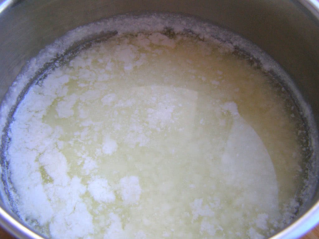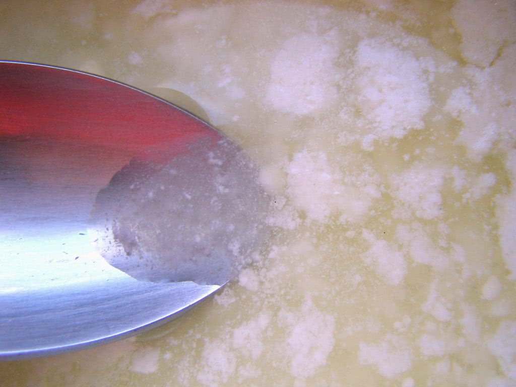 Готовый оттопленный продукт будет узнаваем по отделившейся сыворотке (жидкость на фото) и уплотнившимся сгусткам.