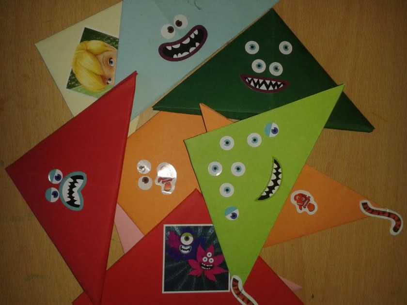 Уголок можно сделать и из квадратного отрезка. Сначала надо на листе бумаги начертить большой квадрат, затем его разделить на четыре равных квадрата. Квадрат вверху справа надо стереть. Нижний справа и слева верхний надо разделить по диагонали на два ровных треугольника, внешние половинки стереть, чтобы вся фигура напоминала стрелку. Теперь вырезать ее, а два треугольника согнуть так, чтобы они прикрыли квадрат и легли друг на друга. Теперь части треугольников склеить между собой, и можно надевать на уголок страницы. Опять же украсить ее и разрисовать вы можете на свой усмотрение, верхнюю часть можно обрезать, чтобы образовалось сердечко или сделать зубастого монстра.