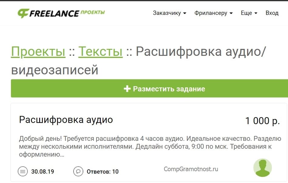 Другая биржа, где можно заказать расшифровку аудио/видеозаписей – freelance.ru