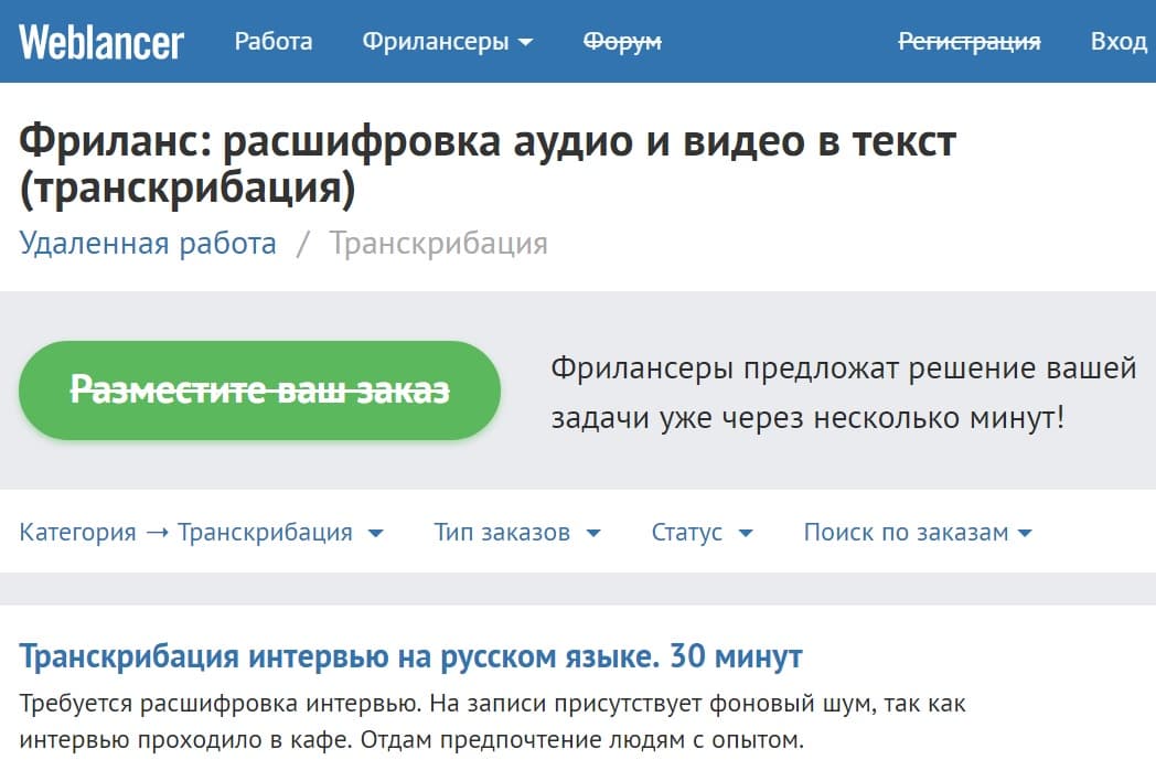 Как же можно сделать заказ на бирже фриланса? Сначала нужно зарегистрироваться на сайте биржи, то есть пройти там регистрацию. Затем можно будет разместить заказ – задание на транскрибацию.