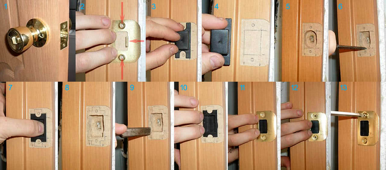 - Теперь можно, вставив одну из ручек в отверстие замка, отметить точное месторасположение ответной планки. Для этого язычок покрывают каким-либо красящим веществом и, придерживая ручкой язычок в углубленном состоянии, прикрывают дверь до конца. Удостоверившись, что дверь прикрыта плотно, нужно отпустить ручку, защёлка упрётся в дверной блок и сделает отметку. А уже по этой отметке можно рассчитать место установки ответной планки. Выборку под неё сделать стамеской и молотком, как описано выше. По окончании выработки паза, планку установить на место и закрепить с помощью саморезов.