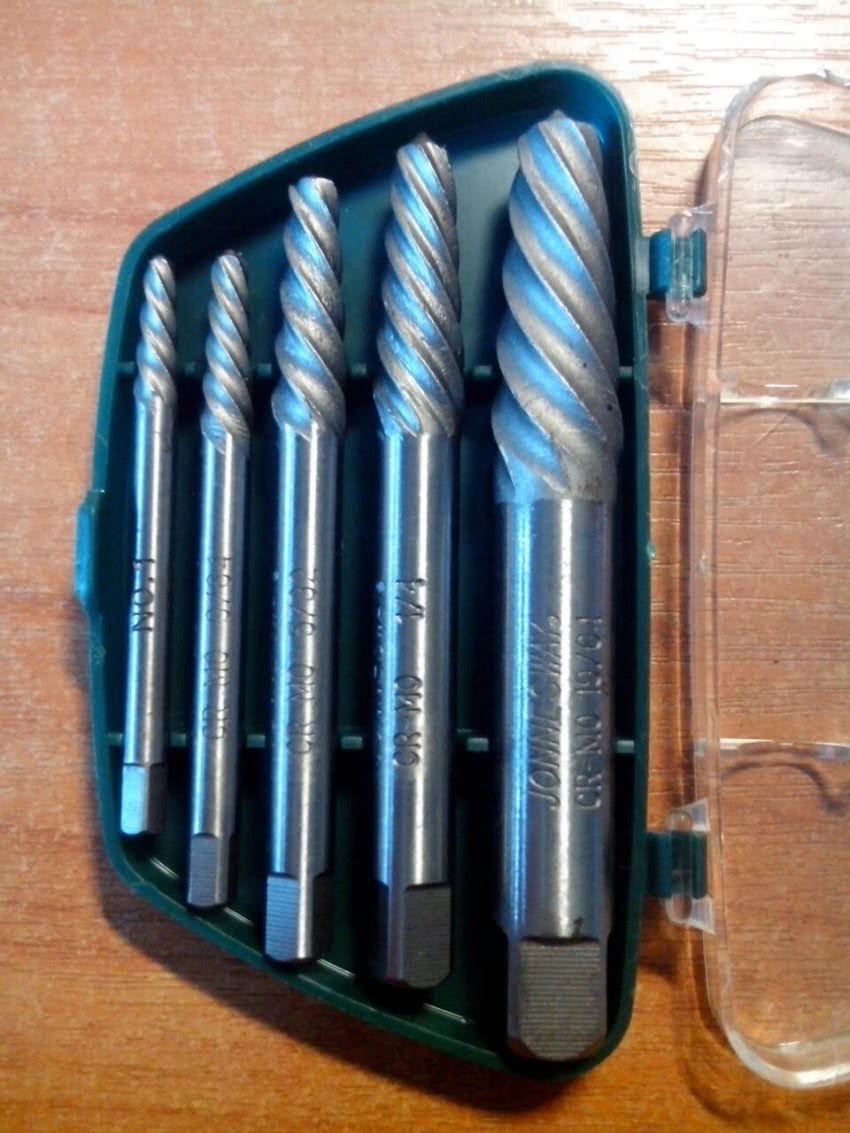 Винтовые экстракторы. Это специальные инструменты, применяемые для сломанных болтов. Винтовые экстракторы работают просто: просверливается пилотное отверстие в метизе и устанавливается экстрактор в отверстие. При повороте экстрактора края войдут в пилотное отверстие и вывернут болт. Этот процесс рабочий, проверенный и наиболее эффективный.