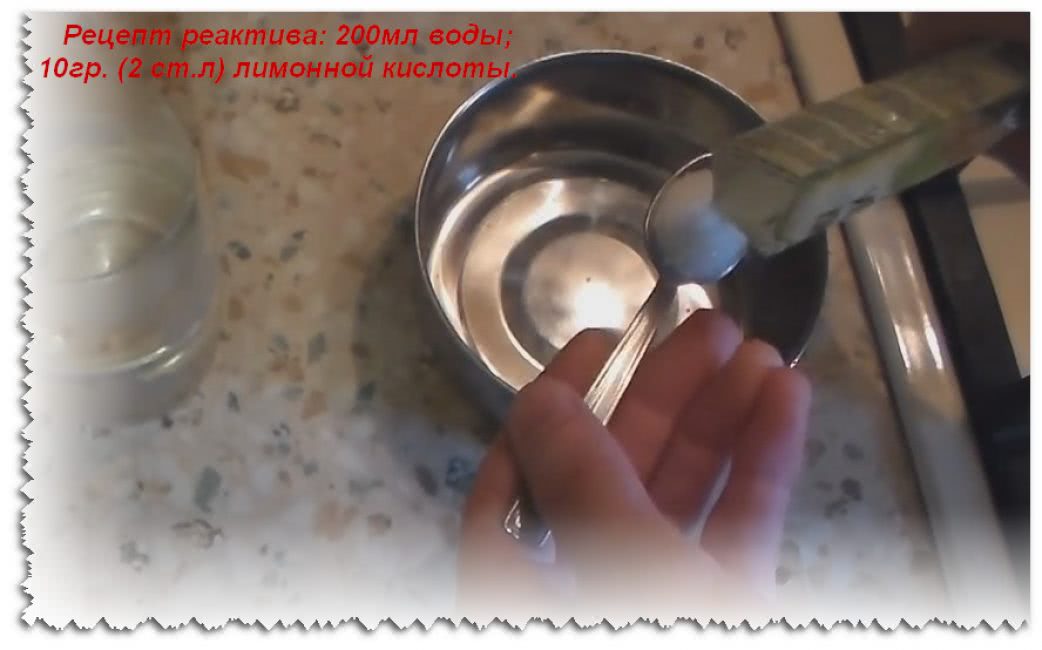 Травить инструментальную сталь будем лимонной кислотой. В ёмкость из нержавейки, подходящей под размер заготовки, высыпаем 2 столовых ложки лимонной кислоты и добавляем стакан (200мл) водопроводной воды.