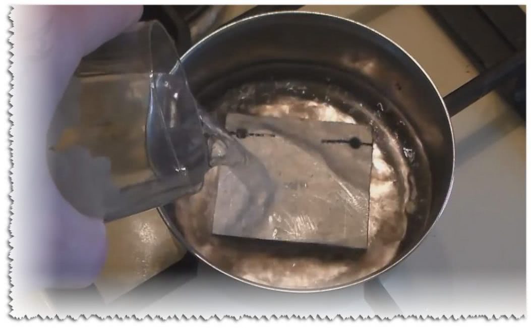 Ставим на огонь. Температура будет выступать в роли катализатора, т.е. ускоряющим фактором для протекания химической реакции. Воду доводим до кипения и максимально уменьшаем огонь, который нужен лишь для поддержания температуры. Кипятить заготовку на всём протяжении травления не нужно, поскольку на результат и время это никак не отразится, а только будет быстрее выкипать вода.
