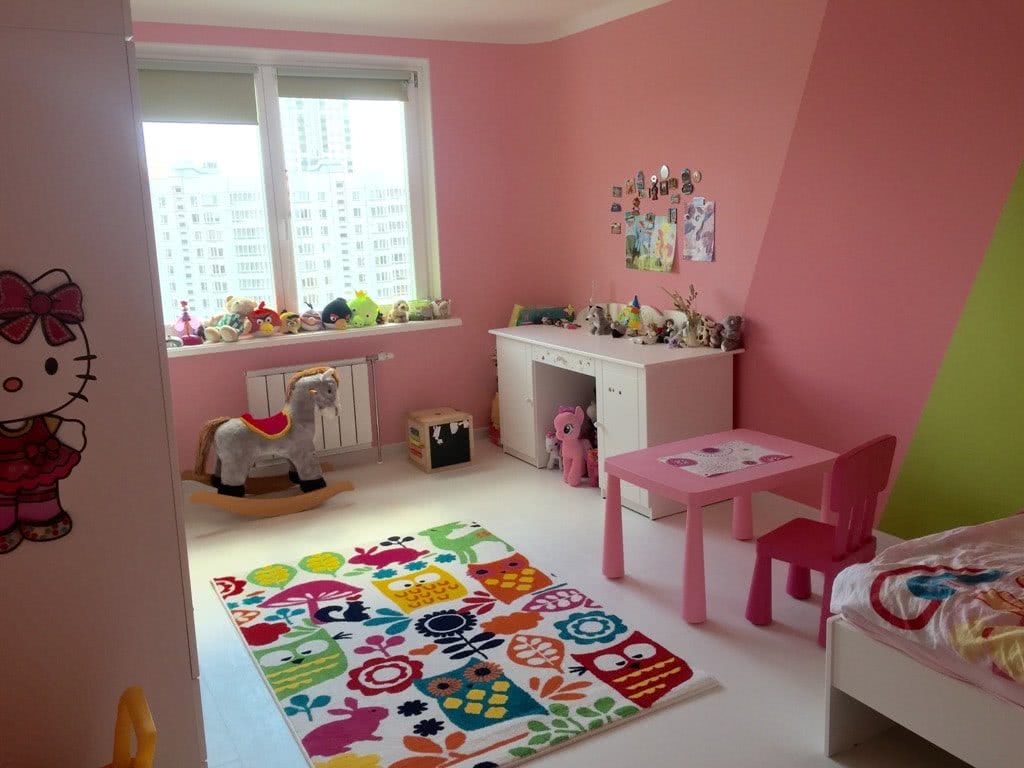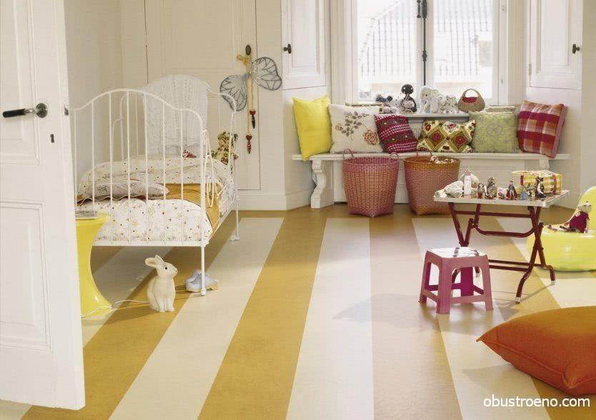 - Линолеум в детскую стоит выбирать поярче: конечно, он не должен быть кислотно-зеленого цвета (это слишком утомительно и для глаз, и для психики), но синие, оранжевые и персиковые оттенки будут вполне уместными. Также хорошо смотрятся покрытия с рисунком, но я бы не советовал приобретать материал с обилием мелких изображений: он не только вызывает «рябь» в глазах, но и усложняет поиски упавших на пол игрушек и школьных принадлежностей.