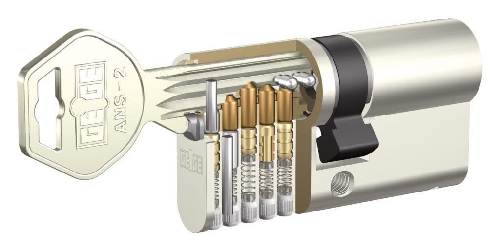 Цилиндровые замки для металлических дверей работают за счет пинов или штифтов. В каждом из них два элемента различной длины. Если вставить в такой замок ключ, то штифты выстраиваются в необходимом порядке, он открывается. Если попытаться отворить дверь не родным ключом, то штифты в линию не выстроятся, механизм не откроется. Как и в случае с сувальдным замком, чем большее количество пинов присутствует в цилиндровом механизме, тем сложнее его взломать.