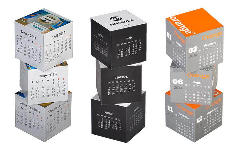 - Поиграть с формой календаря можно по-разному. Ну, например сделать из него кубики! Не забудьте нанести логотип на верхушку каждого кубика и выбирайте яркие контрастные цвета. Вот ваш оригинальный подарок готов!