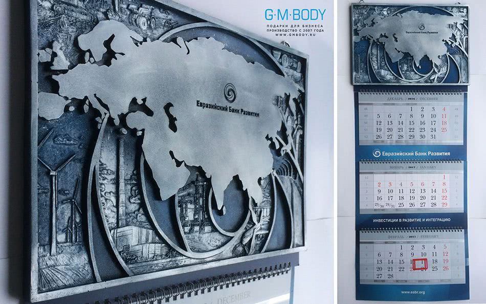 - Нечто действительно завораживающее – объемный календарь в металлических тонах от Евразийского Банка Развития. Здесь действительно задаешься вопросом: это календарь или искусство? Повторять рисунок полностью точно не стоит, но взять за основу идею и воплотить ее в своих тонах – стоит попробовать!