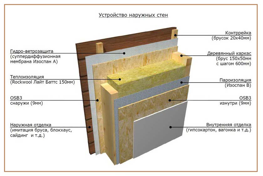 Это же относится к выбранной согласно расчетам толщине стены, которая равна толщине утепляющего слоя и совпадает с сечением стоек. Самый минимальный размер – 150 мм, более тонкие стены не обеспечат требуемой теплонесущей способности. Исключение могут составлять садовые домики, не рассчитанные на длительное (круглогодичное) проживание.