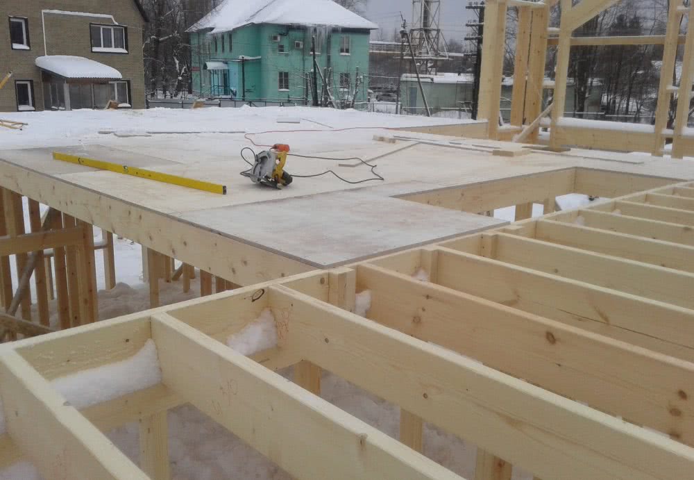 Перед возведением каркаса следующего этажа необходимо настелить половой настил поверх балок перекрытия. Для этого применяют шпунтованные половые доски или плитные материалы (OSB, фанера) в два слоя. Стыки второго слоя не должны совпадать со стыками первого. В случае применения половой доски до окончания строительства от загрязнения и повреждения её защищают листами ДВП или плотного картона.