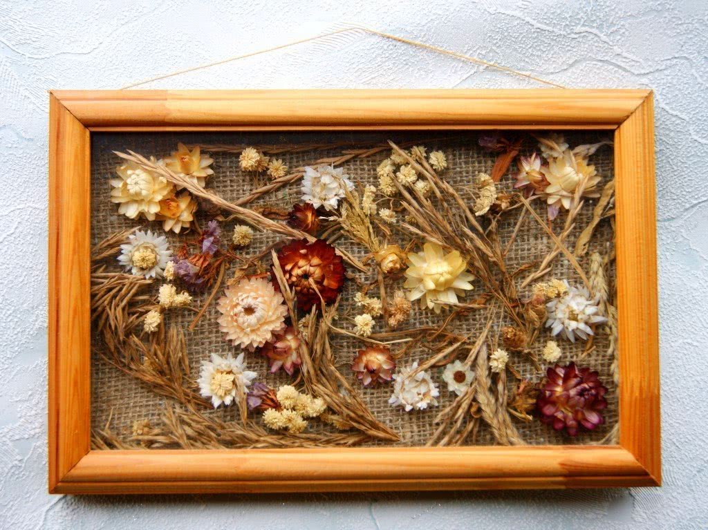Создание композиций из сухоцветов относится к декоративному стилю флористики. Для этого не потребуются специальные навыки и дорогостоящие материалы. Сырьем будут служить дары природы, умещающиеся на плоскостной поверхности. Это могут быть высушенные растения, семена, цветы, лепестки, стабилизированный мох.