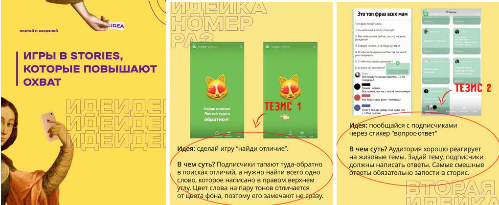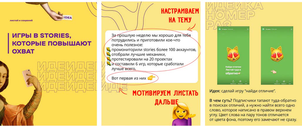 Тут немного сложнее. Галереи с сюрпризом заставляют человека пролистать все фото от первой до последней и получить какую-то эмоцию. Самый простой пример — раздевающаяся девушка. Причем на последней фото она может предстать не без одежды, а в какой-нибудь прикольной позе или чем-то прикрытая (вашим товаром, например). Распаковка подарка, нанесение макияжа — любое действие, которое заканчивается не так, как ожидает пользователь, подойдет для такой галереи. В коробке с подарком может оказаться что угодно, а макияж может выглядеть забавно, хотя начинался серьезно. Придумайте что-нибудь для вашего аккаунта, заставьте похихикать и написать комментарий в духе “смешно”. Главное, что до конца пролистали и лайкнули.