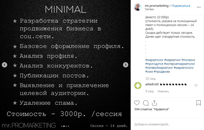 В качестве примера представлен профиль @mr.promarketing с тарифами в карусели.