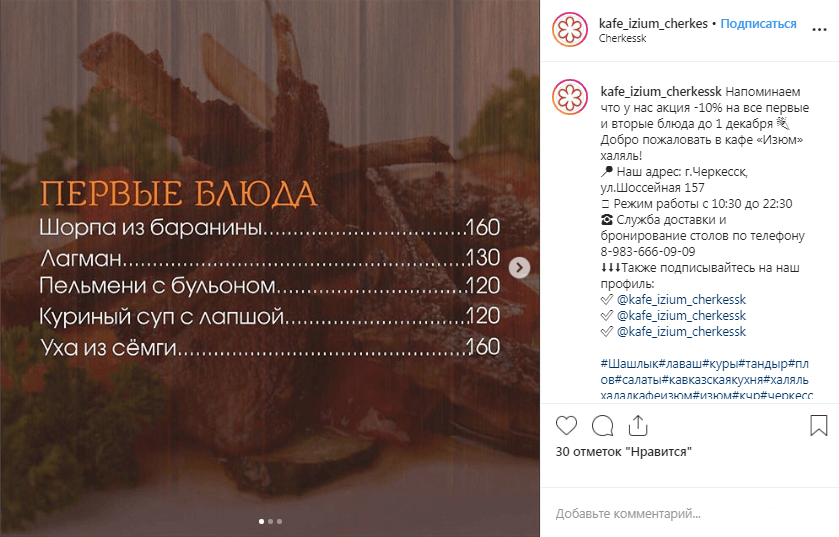 Слайдер – находка для магазинов, кафе и баров. В нём вы можете удобно презентовать пользователям сезонное предложение или меню, как это сделало @kafe_izium.