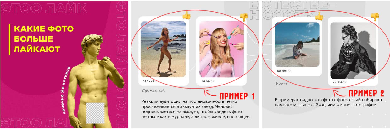 Пример может занимать больше места, чем сам тезис — в зависимости от того, что важнее в данном случае. Если речь идёт о том, какие фотографии больше лайкают, то и акцент нужно делать на фотографиях.