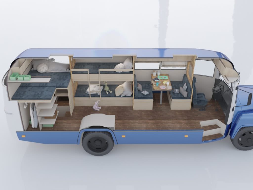 Отделка внутри автомобиля выполняется по собственным предпочтениям. Дом на колесах оборудуется полками, элементами декора и мебелью. В дополнение можно создать навес, который по потребности можно раскрыть на природе.