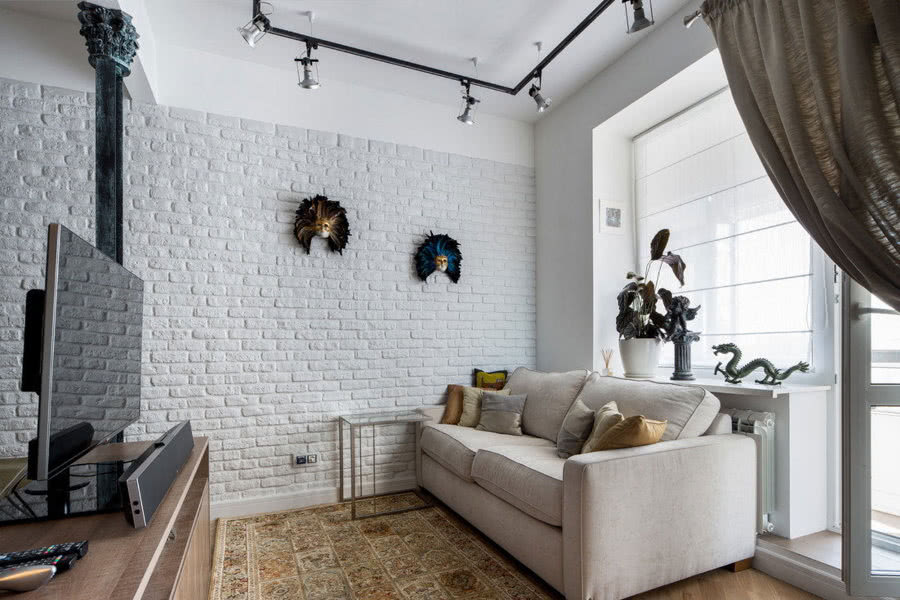 В небольшой гостиной такая отделка стен может утяжелить пространство. Смягчат обстановку выделяющие элементы: фотографии в рамках на стенах, ковер на полу, гардины и шторы на окнах. Белые вертикальные плоскости гармонично сочетаются с бежевой мебелью. Если гостиная совмещена с кухней или столовой, стена из белого кирпича может визуально разделить пространство на функциональные зоны.
