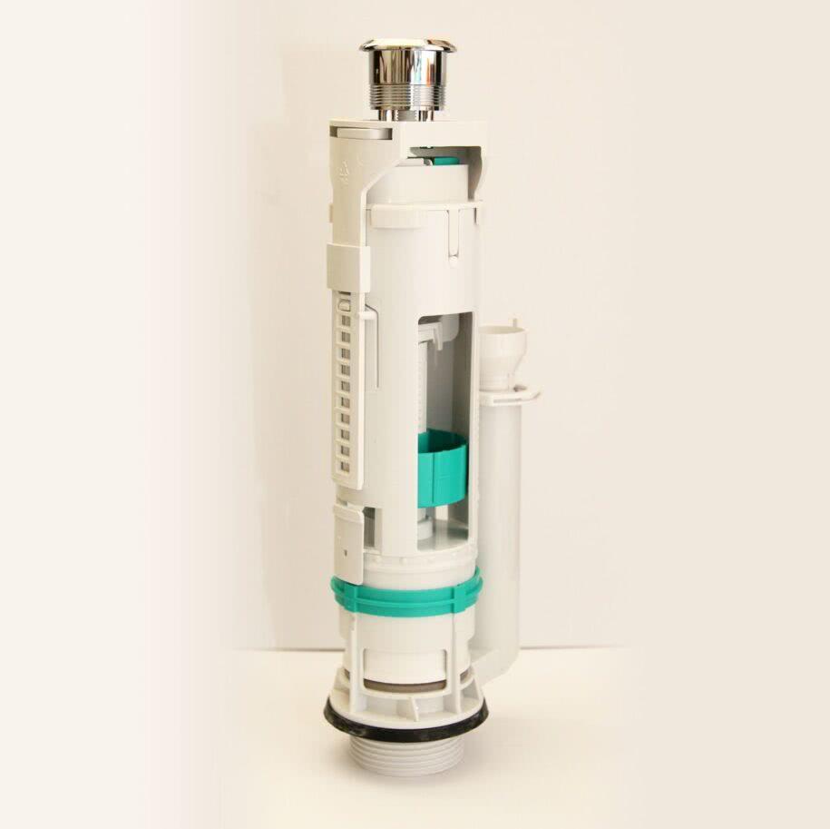 Впускной клапан (он же заливной, наливной или наполнительный) служит для подачи воды и прекращения налива при достижении ограничителя. Выпускной клапан (он же сливной) берет на себя функции смыва воды, регулировки объема и скорости потока.