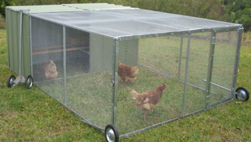 Данная конструкция немного сложнее в изготовлении, чем ранее описанная деревянная клетка, но имеет ряд существенных преимуществ, главные из которых — гигиеничность и несравненно больший срок службы. Клетка рассчитана на содержание 5-6 куриц и одного петуха, обычно используется в составе «батареи», что позволяет значительно сэкономить на площади сарая.