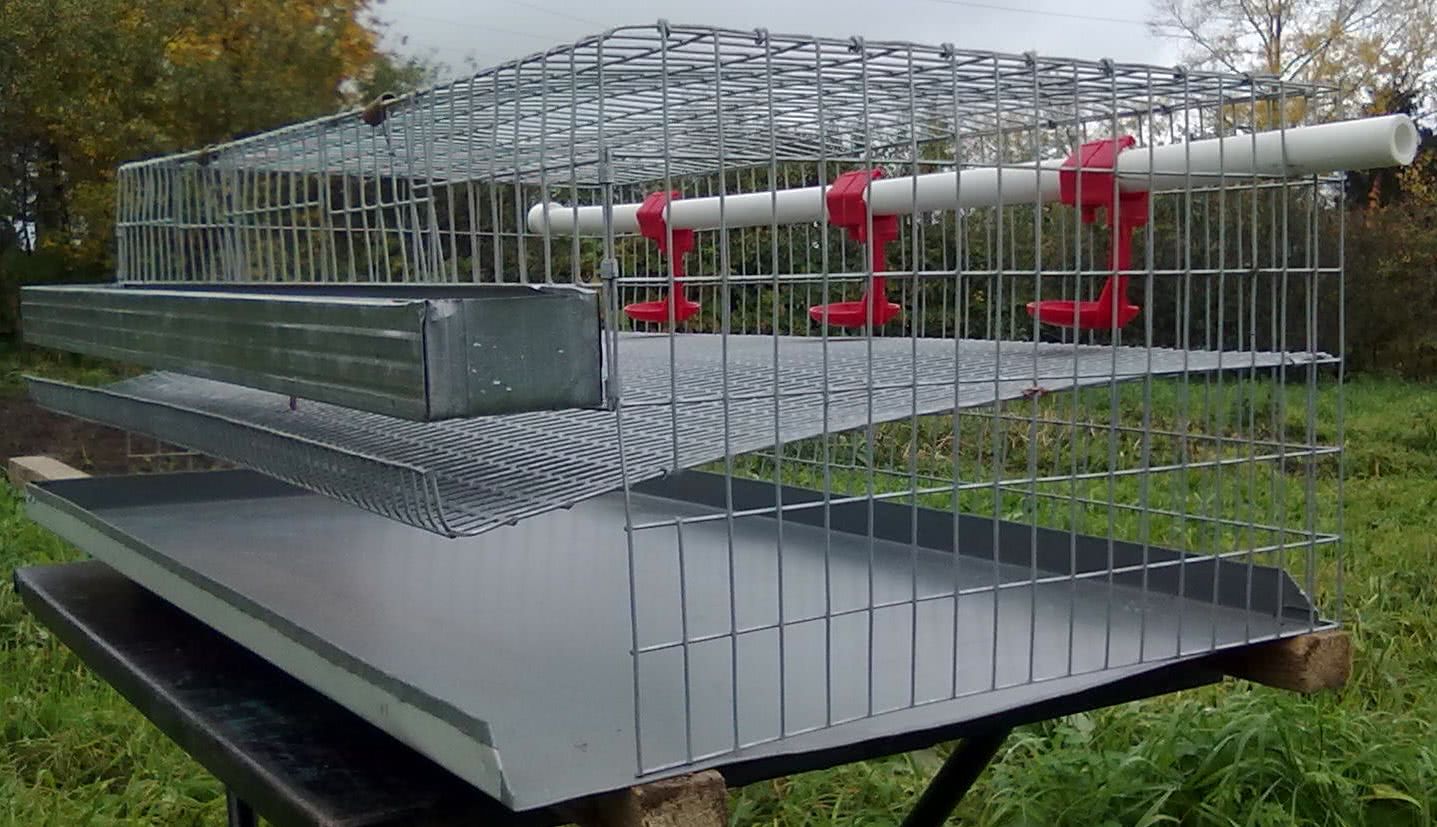 Для удобства уборки под клетку устанавливается щит для задержания помета. Для экономии места кормушки устанавливаются снаружи, а поилки чаще всего представлены ниппельной системой.
