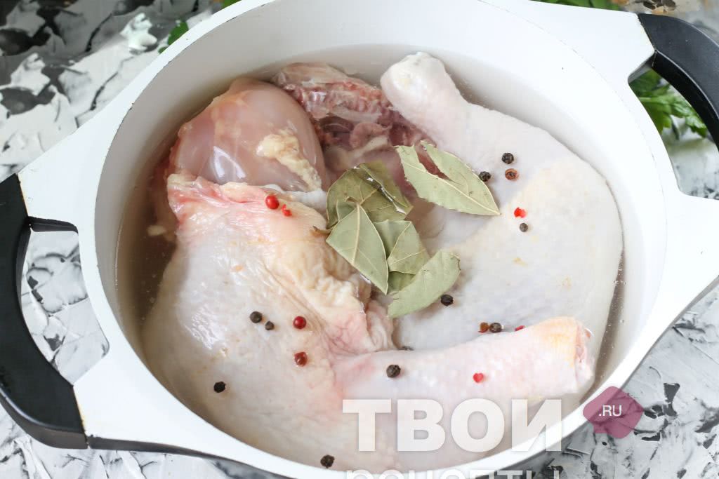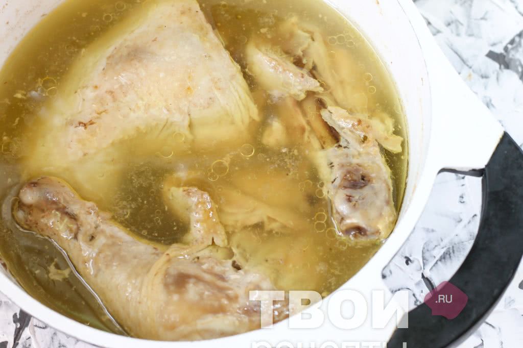 Куриное мясо тушат или варят до тех пор, пока оно не отделится от костей. Филе готовят примерно 30 минут. Во время варки в бульон добавляют специи и соль.