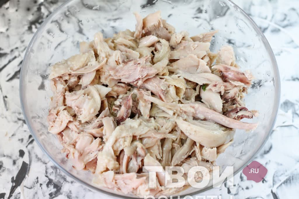 - Прелесть рецепта в том, что в отличие от прочих, курицу отваривать заблаговременно не придется. Просто нарежьте мясо небольшими кусочками, поместите в миску.