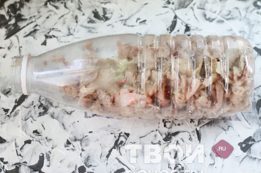 - В пластиковой бутылке отрежьте верх и выложите туда курицу, залейте бульоном с желатином. Можно курицу сразу смешать с бульоном и выложить все вместе в бутылку, как вам будет удобно.