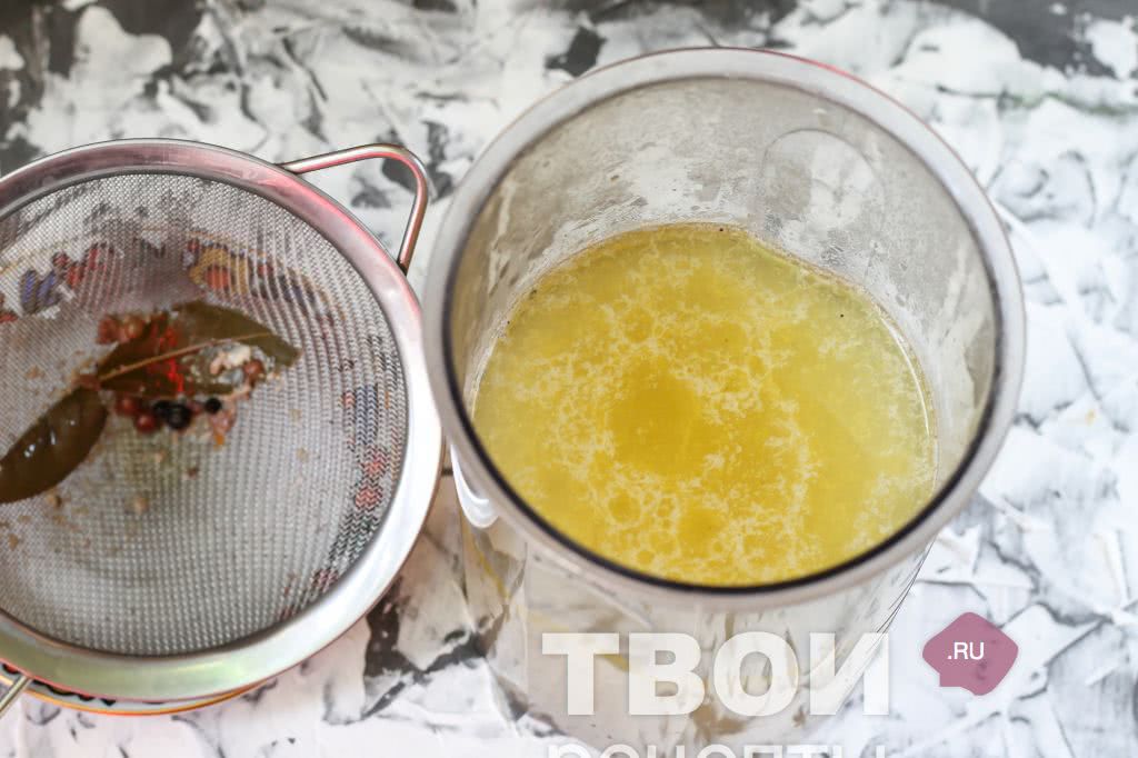 - В остывший куриный бульон добавляют желатин примерно на полчаса.