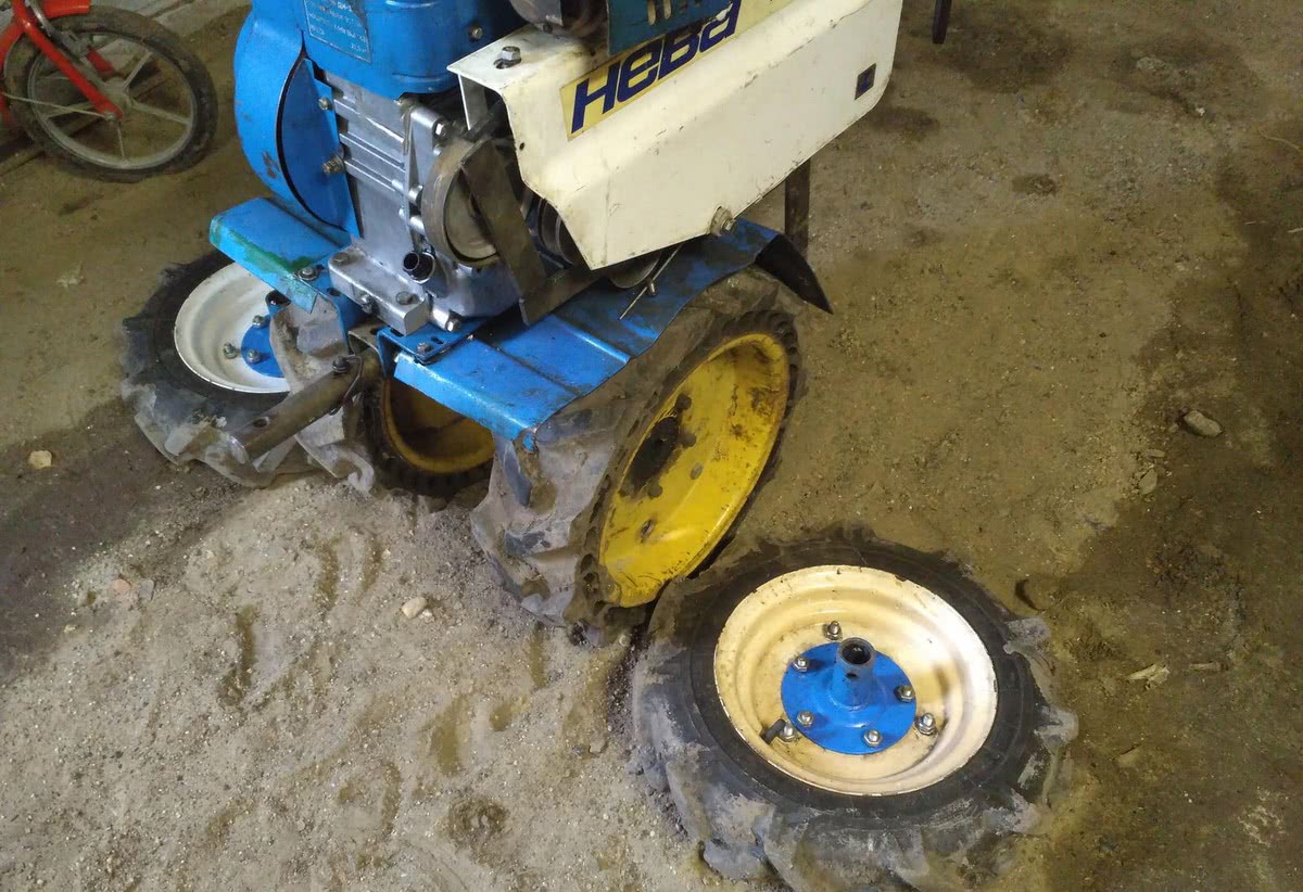 Заводские модели обычно оснащены подходящей колёсной парой. Но учитывая нагрузки на этот элемент конструкции, колёса часто ломаются. Соответственно фермеру приходится самостоятельно покупать вышедшую из строя деталь.