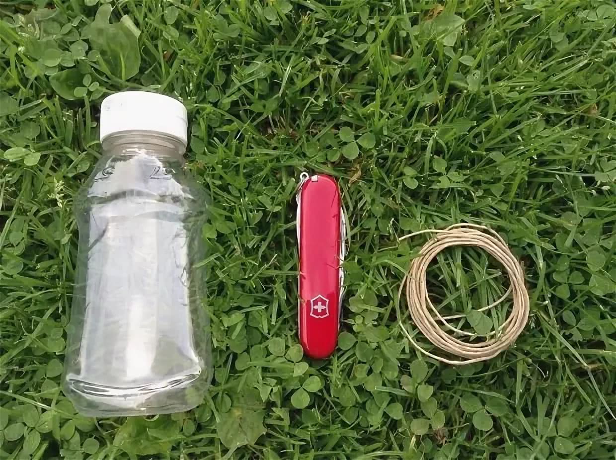 Ковшик из пластиковой бутылки можно изготовить в лесу, если с собой есть нож, бечевка и маркер. Объем емкости значения не имеет – чем больше, тем лучше. Заготовку нужно положить на землю на стороне, которая смотрит вверх, начертить контур отверстия. Он должен повторять силуэт английской буквы «W». Ножом вырезать дырку.