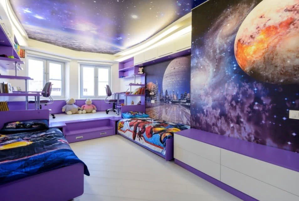 Такое оформление приобрело популярность в последнее время и больше всего подходит для детей дошкольного возраста. Подобная тематика им очень нравится, поэтому можно обстроить комнату так, чтобы она была буквально пропитана космосом: