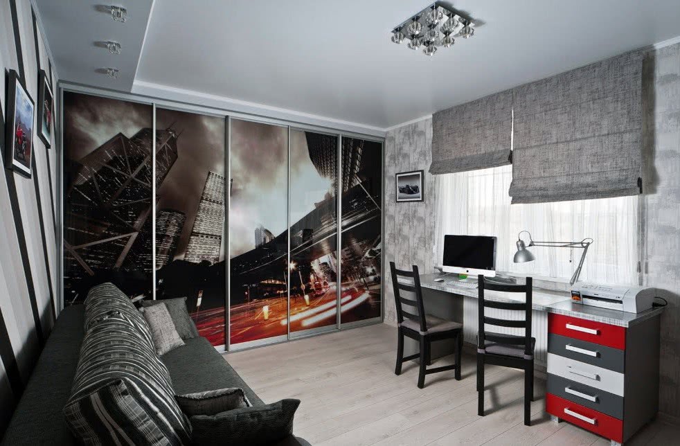 Минимализм – это минимум дизайнерских изысков, максимум открытого пространства и большое количество аксессуаров, посредством которых подросток сможет самовыразиться. Если парень скромен и стесняется выставлять напоказ собственную креативность, минималистская отделка поможет ему проявить имеющиеся таланты с течением времени. Атрибутами стиля традиционно принято считать тёмно-серые и чёрные тона, служащие фоном для более ярких деталей. Возможно, парень придёт в восторг от идеи установить натяжной потолок, усеянный маленькими лампочками.