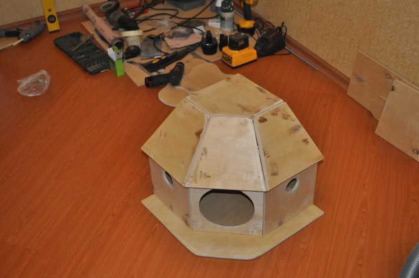 На первом этапе из листов ДСП собирается коробка произвольных размеров (без одной боковой стенки), в нашем случае просторный домик для кошки имеет в длину 80 см, по ширине — 55 см, высота — 30 см. Очертания входа могут быть любыми, при желании наделить конструкцию индивидуальными особенностями, можно вырезать подобие головы кошки. Собранный каркас домика крепится к основанию, как показано на фото: