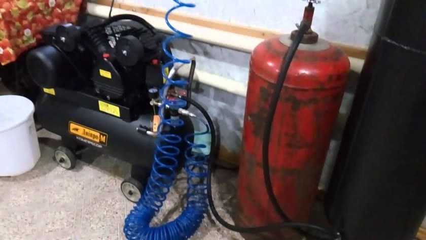 Также можно сделать компрессор из газового баллона. Но сначала из баллона нужно выпустить газ, после чего скрутить вентиль. Далее, нужно полностью заполнить баллон водой для удаления остатков газа. Баллон следует промыть водой несколько раз и, по возможности, высушить. Обычно под баллон устанавливают газовую горелку и выпаривают из емкости всю влагу.
