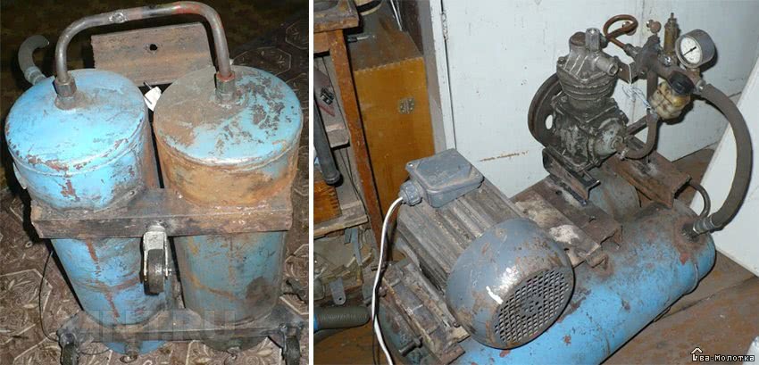 - Ресивер. Для этого подойдет огнетушитель или газовый баллон, который должен быть полностью пустым. Можно сварить самодельную емкость из листового железа и толстой трубы.