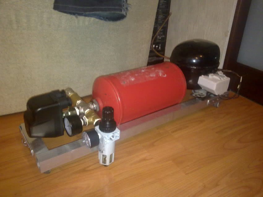 Как уже говорилось, собственноручная сборка часто бывает надежнее заводской. Отдельным плюсом служат технические параметры. Например, согласно статистике, компрессоры от холодильников служат десятки лет. Относительно огнетушителя можно сказать, что это изделие имеет десятикратный запас прочности.