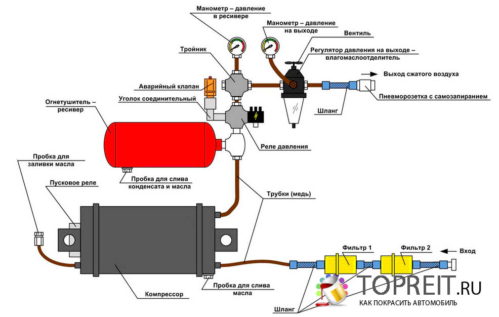 Далее, к компрессору подсоединяется ресивер и обвязка с автоматикой. Как ее сделать, было рассмотрено в предыдущем пункте.