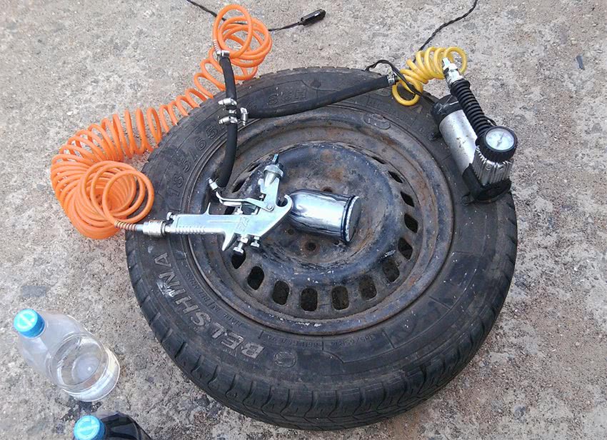 Для изготовления самодельного компрессора, в качестве емкости для хранения сжатого газа можно задействовать камеру от автомобильной покрышки. Для проверки ее герметичности достаточно ее накачать и поместить в емкость с водой. Если в ней имеются отверстия или другие повреждения, то, скорее всего, через них будет выходить воздух, обнаруженные дефекты целесообразно заделать с помощью резиновых заплаток.
