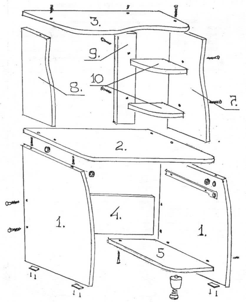 Приготовьте шуруповерт, 2 отвертки (плоская и крестообразная). Согласно схеме, положите нужные по инструкции части на пол внутренней стороной вверх, положите металлические крепления, чтобы совпали отверстия, и соедините их крепежными винтами и заглушками. Каждая часть соединяется точно по инструкции по сборке данного стола.