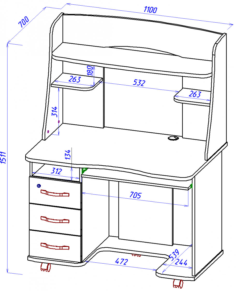 - 3 ящика шкафа (для разных принадлежностей, компьютерных кабелей и т.д.)