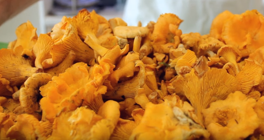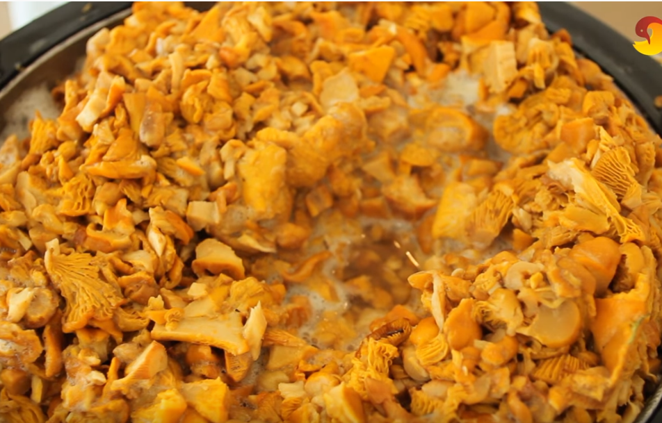 - Грибы (в данном случае лисички) перебираем, очищаем, тщательно промываем в проточной воде. Режем кусочками, но необязательно.