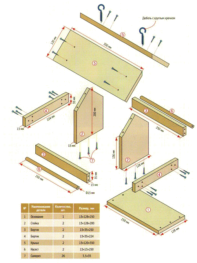 Конструктивно такие домики имеют поддон с бортами, ножки-опоры и крышу. Выполняются очень просто. Достаточно вооружиться лобзиком, молотком, гвоздями, наждачной бумагой и верёвкой. Подробное количество деталей вы можете посмотреть на чертеже с размерами.