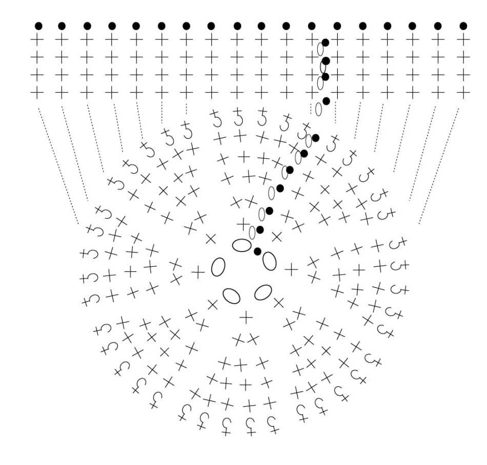 - Пятый ряд – прибавляем столбики через 3 петли.