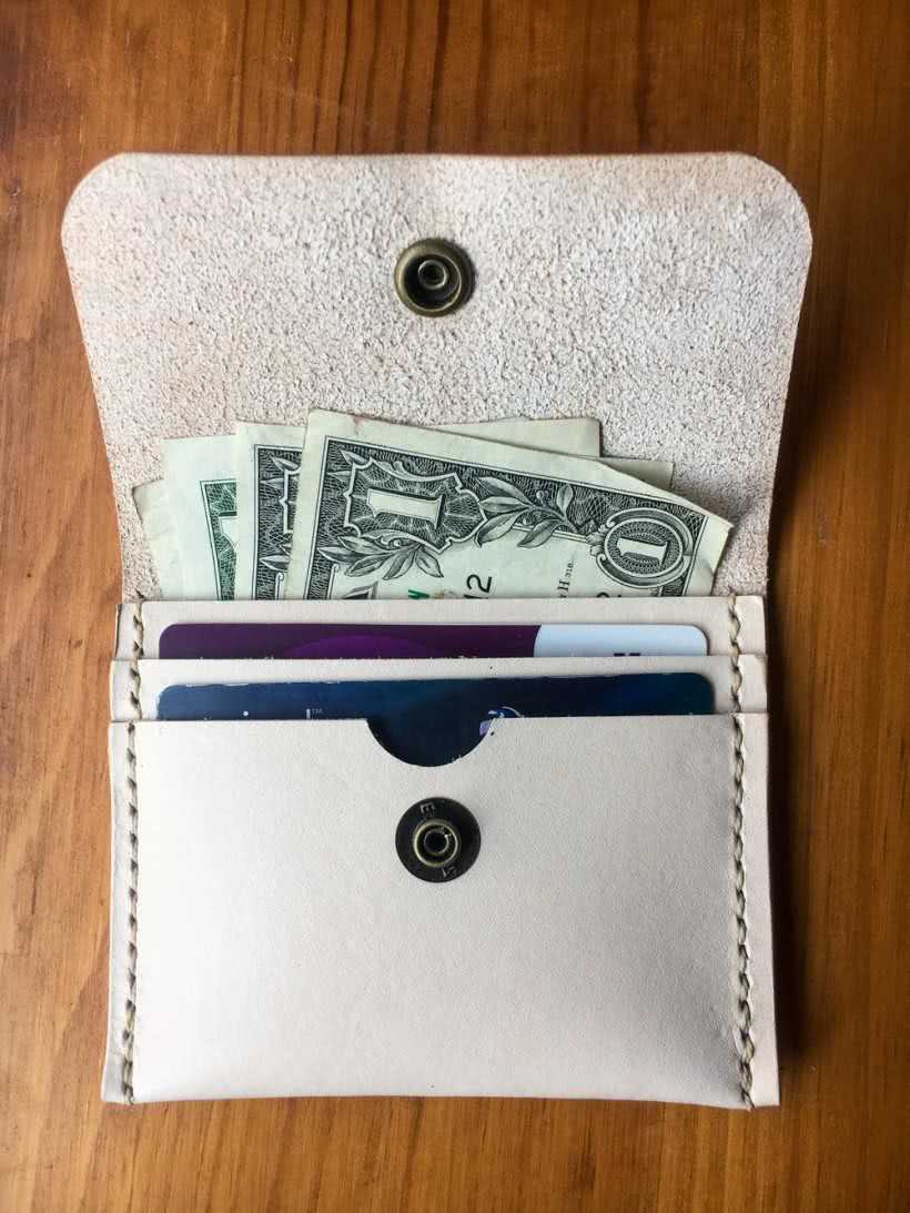 Вот так выглядит кошелек из натуральной кожи сделанный своими руками, наполненный купюрами, пластиковыми карточками и мелочью. Как видно, благодаря простоте конструкции, сшить такой кошелек за пару часов может любой домашний мастер.
