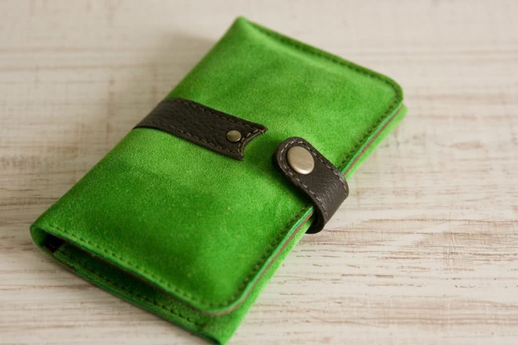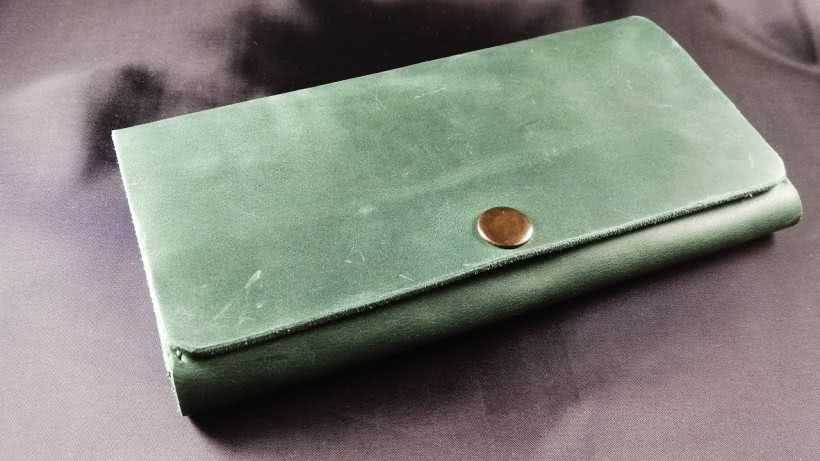 Кнопка-застежка установлена на кошельке и проверена ее работа. На фотографии показан сшитый своими руками женский кошелек. При желании по своему вкусу можно фломастером желаемого цвета закрасить торцы кожи и нанести рисунок элеткровыжиалкой или тиснением.