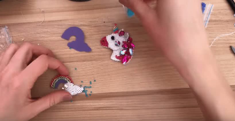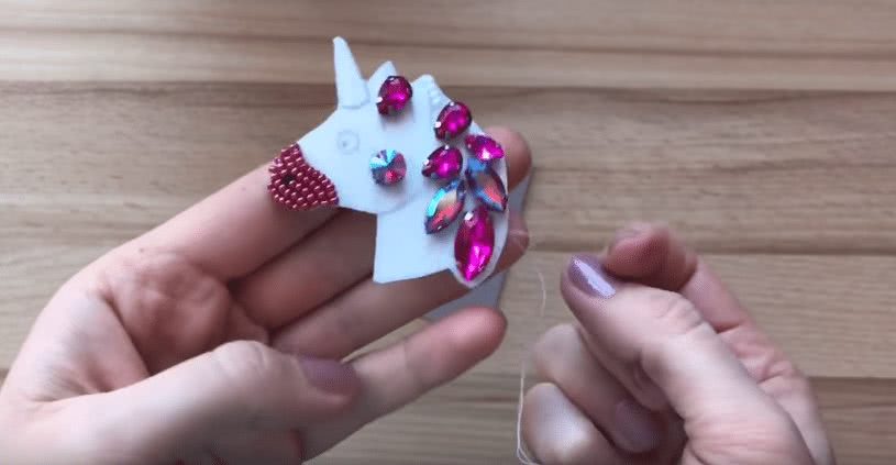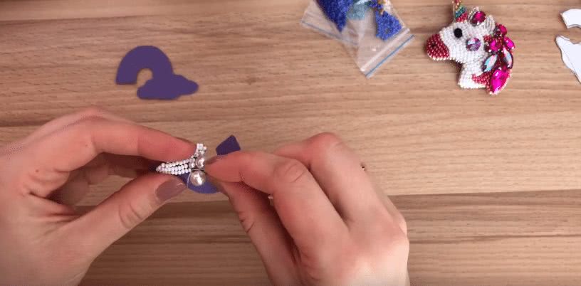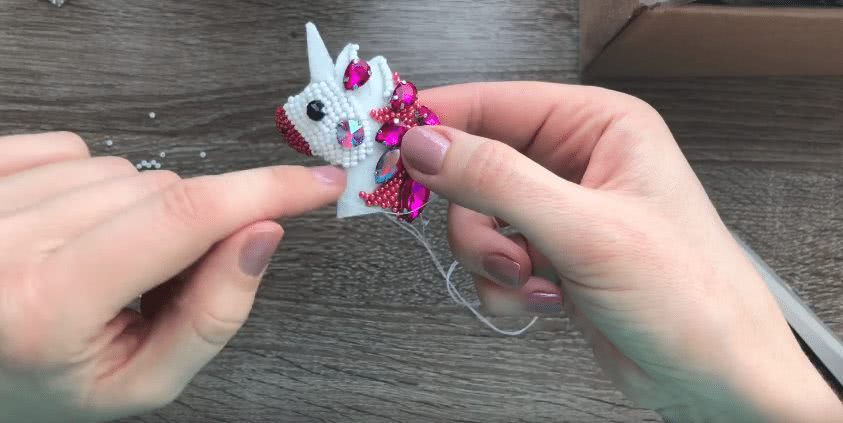 Приклеиваем кристаллы в намеченном порядке при помощи клея. Для надёжности, помимо приклеивания, советую также прошить. Далее занимаемся зоной носика единорога. Попытайтесь найти бледно-розовый цвет бисера. Ноздрю (маленькую точечку) оформите чёрной бусинкой.