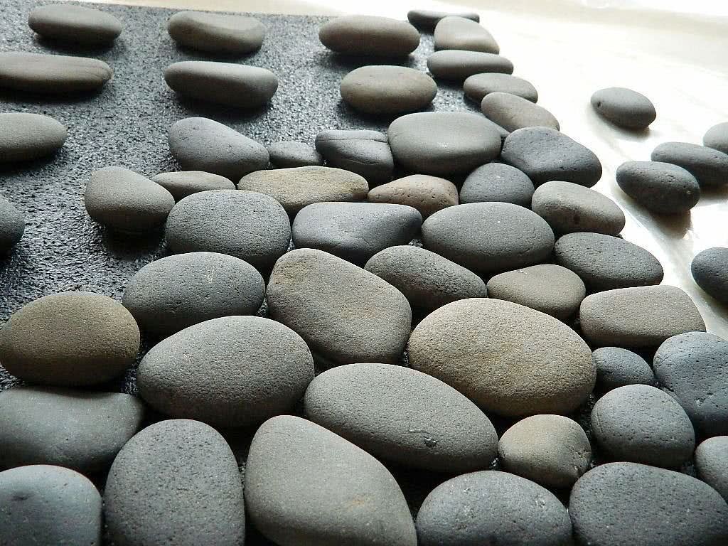 камни выбираются различной высоты и диаметра, для декоративных ковриков, а так же коврика для душа лучше использовать максимально одинаковые камушки.